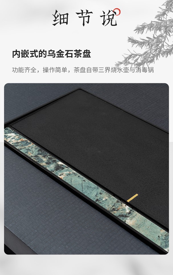 “叙茶桌”在功能设计上强调一体化。桌面内嵌乌金石茶盘,并配置三界烧水壶与消毒锅,实现泡茶流程中的烧水、冲泡与清洁需求。整体操作方式简洁直观,减少额外设备摆放,让桌面保持整齐。