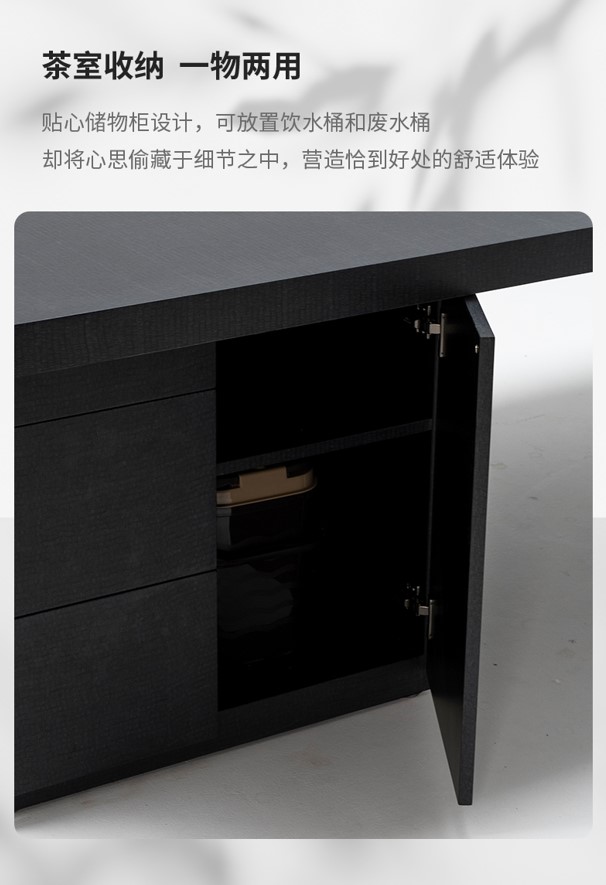 内部设置储物柜空间,可放置饮水桶与废水桶,并采用分隔式设计,使物品分类更清晰。五金部分选用优质配件以提升耐用度,抽屉则配置品牌轨道系统,推拉顺滑不卡顿。