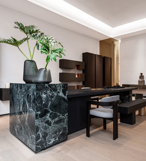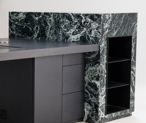 另一大视觉亮点是可选的普拉达绿大理石岛台。深绿色纹理层层浮现,整体观感沉静而富有层次,强调天然石材独有的变化美感。品牌同时说明,大理石属于天然材质,纹理差异属于正常现象。