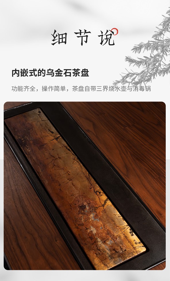 在功能布局上,“道茶桌”并未追求复杂,而是强调实用整合。桌面内嵌乌金石茶盘,并配置三界烧水壶与消毒锅,满足泡茶过程中最核心的需求。