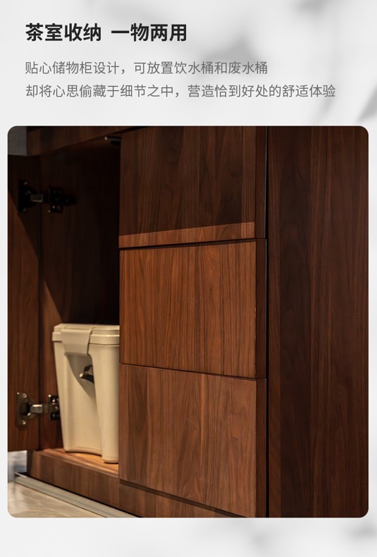桌体内部配置储物柜空间,可放置饮水桶与废水桶,适合长期泡茶或多人使用场景。内部采用分隔式设计,分类清晰、卫生整洁。五金部分选用优质配件,强调不易生锈;抽屉轨道则为品牌产品,推拉顺畅,耐用度高。