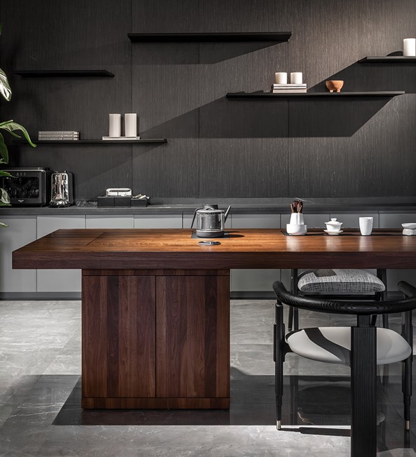 “道茶桌”的主体台面选用意大利ALPI品牌胡桃木木皮。经过进口面漆处理后,木纹更加清晰,触感细腻而温和。胡桃木本身色调沉稳,不抢眼,却耐看,适合长时间使用的茶空间。