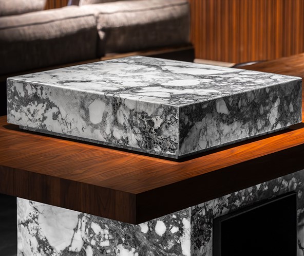 桌面岛台可选寒江雪大理石。灰白色纹理在石面上自然铺展,营造出清冷、克制的视觉氛围,与胡桃木形成对比,却不显突兀。品牌说明,大理石为天然材质,每一块纹理均有差异,属于正常现象。