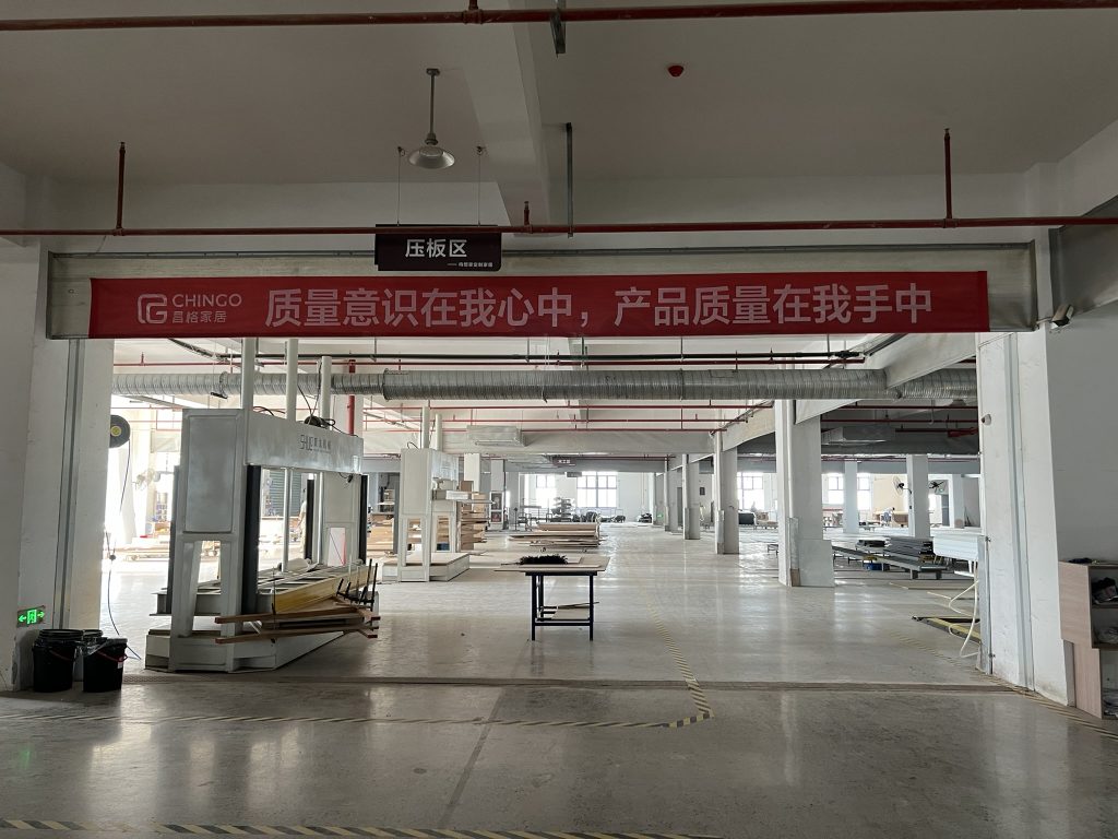 生产现场可见工厂主体为 CHINGO 昌格家居,内部悬挂标语如