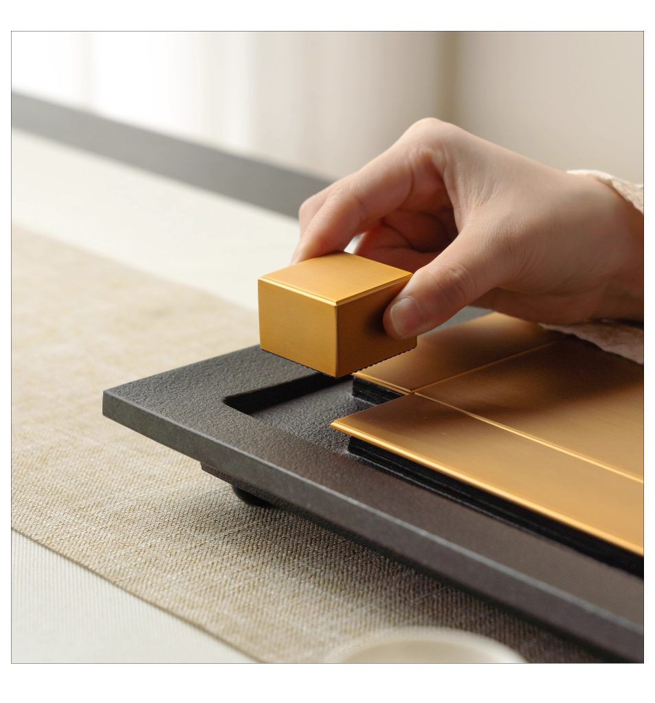 这款茶盘主打乌拉圭黑金石+黄铜组合。黑金石属于天然原石,密度高、不渗茶水、硬度强,日常使用不易磨损或变形;材质结构均匀,因此整体色泽与质感统一。对消费者来说,这类天然石材最大的吸引力在于——耐用、稳定、越用越有质感,长期使用还能形成温润包浆效果,呈现自然养成的光泽。